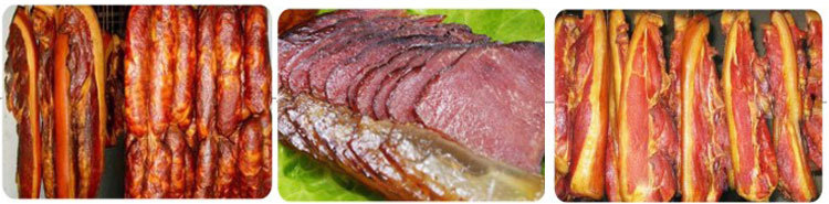 The smoker can be used for sausage, ham, roast chicken, smoked fish, roast duck, bacon, poultry, aquatic products, and other smoked products, steaming, drying, and coloring at one time. The smoked color is good, and the taste is good. Quality Excellent technology and easy operation.