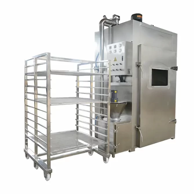2. Box system: international standard thickness insulation wallboard, heat resistance is reliable. High-quality stainless steel material inside and outside of the wall panel. Modularized structure. With the functions of smoking, drying, cooking, cleaning, baking, and so on, users can choose reasonable process procedures according to the different processing requirements of the product, realize the purpose of curing and sterilizing, using PLC automatic programmable control, easy to operate and simple. The three processes of drying, cooking, and smoking can be automatically converted according to the set time.