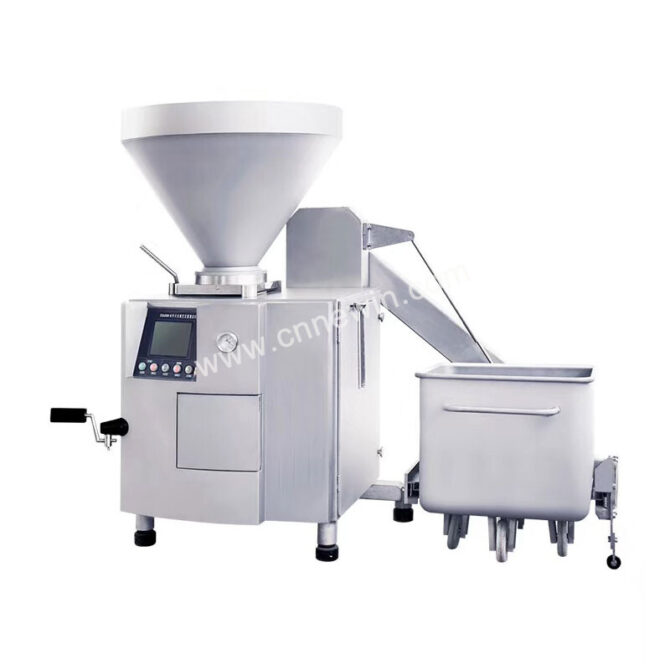 Continuous vacuum sausage stuffer is specially used for filling food, segmenting, and twisting food in food industry processing. It is suitable for filling all kinds of ham and ham sausage-related products. Installing the twisting mechanism can be used for filling table roasted, sausage, and natural casing products.